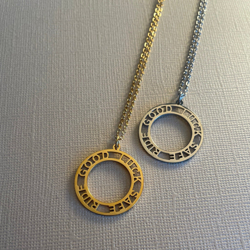 Carry the charm of good luck and safe rides with our round pendant in silver stainless steel or 14k gold-plated finish. Engraved with the heartfelt...