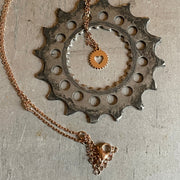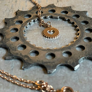 Sharp edges meet round forms. Technology meets love. Crank meets heart. The poetry of precision captured in a small beautiful pendant executed in a subtle 14k rose gold finish on a 16"+2" extendable cable chain.