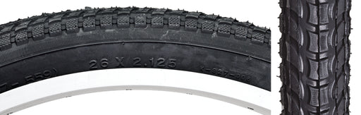 Balloon tire with grooved tread, large air volume for shock absorption. Style: Standard Size: 26x2.125 ISO: 559 Bead: Wire Tread/SW: Bk/Blk ...